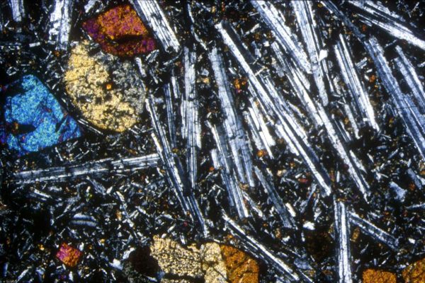 Thin section of basalt with phenocryst and white feldspat